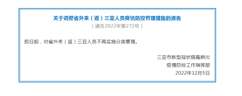 12月5日,三亚市新型冠状病毒肺炎疫情防控工作指挥部发布了《关于调整省外来(返)三亚人员疫情防控管理措施的通告》:即日起,对省外来(返)人员不再实施分类管理。